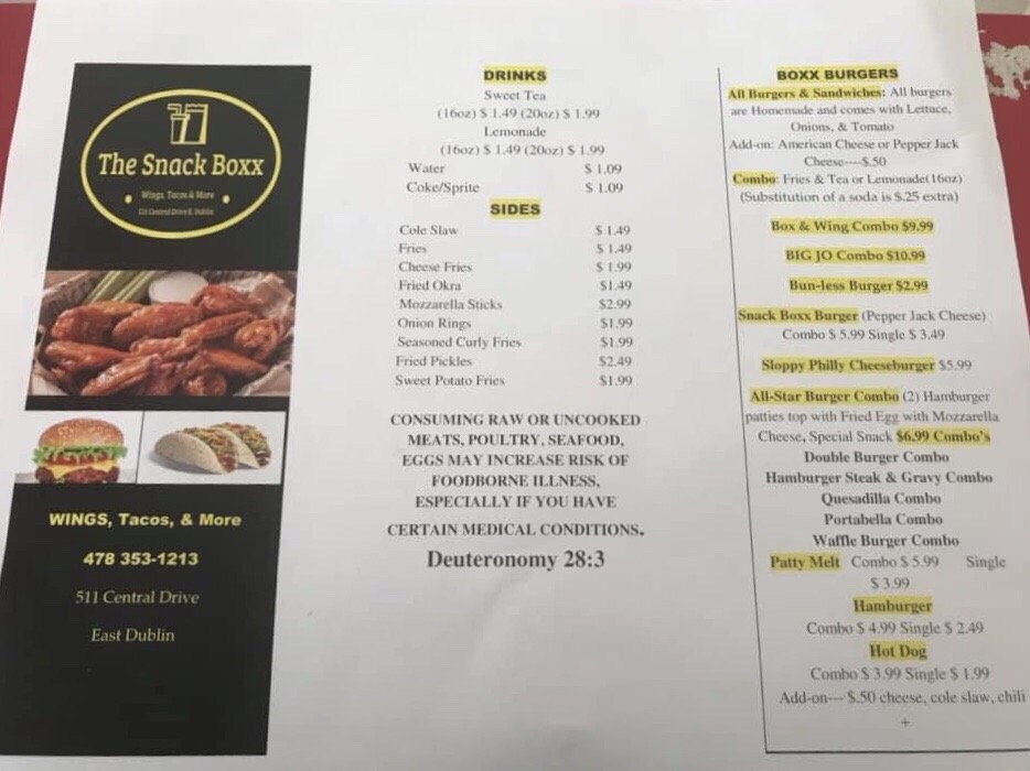 Introducing The Snack Boxx, a culinary gem located at 511 Central Dr, East Dublin, GA. This vibrant eatery specializes in delightful chicken wings, juicy burgers, and classic fish & chips, ensuring there's something for every palate. With the convenience of takeout and pleasant outdoor seating, it’s perfect for casual diners seeking a relaxed atmosphere.